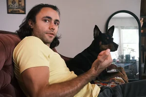 One of his dogs, a shi tzu, jumped up to counter height twice. His other dog, a doberman, sat beside him looking up.