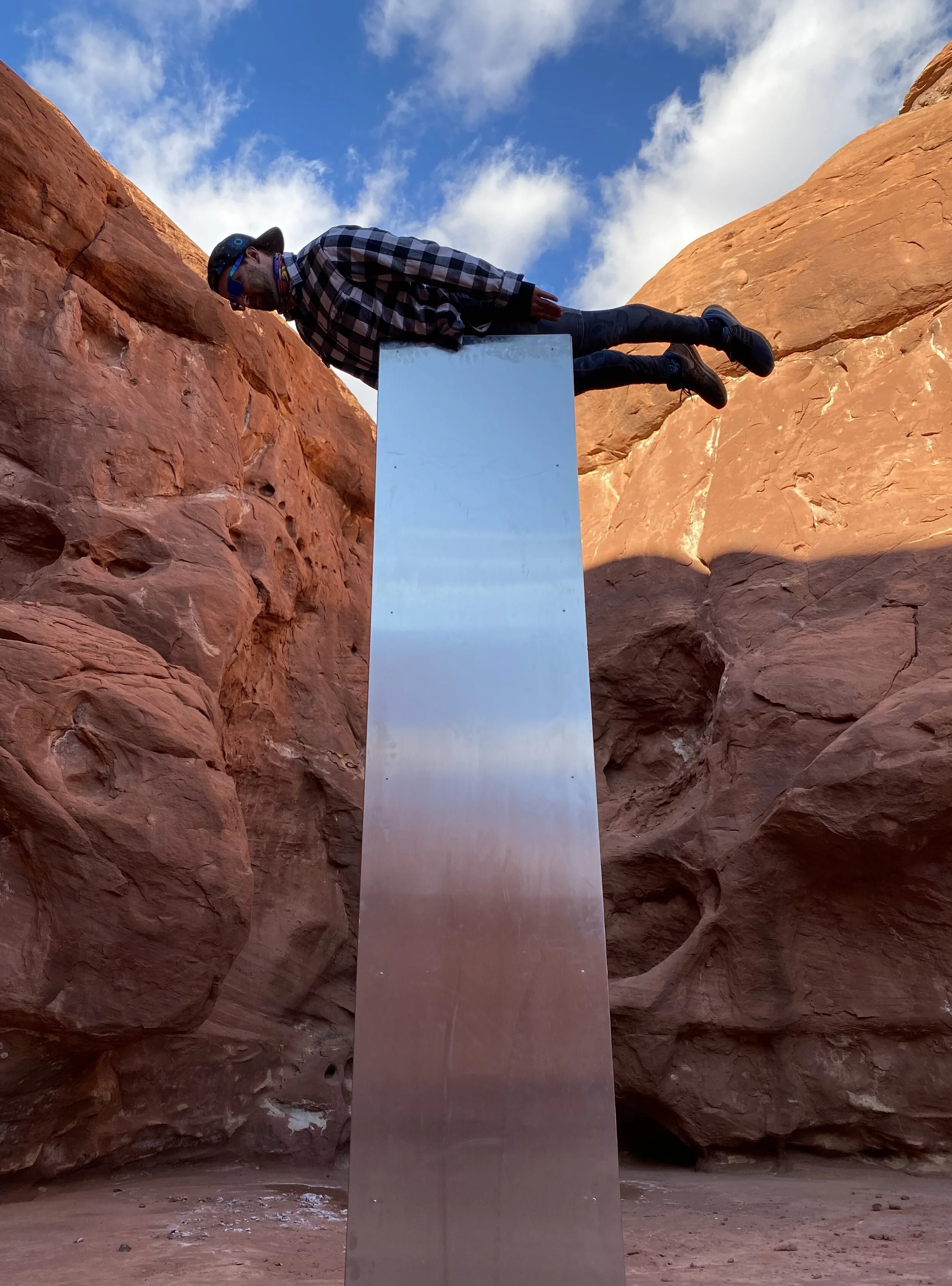 Mark Santamaria and his buddy Holden were the first outsiders to visit the Monolith. They were road tripping in Utah when they learned a biological surveyor team had spotted the mysterious object. After the Utah Department of Public Safety released videos of the Monolith on Monday, November 23, a group of internet sleuths pinpointed the coordinates quickly. Mark and his buddy Holden were there the very next morning—the first ones to arrive on scene.